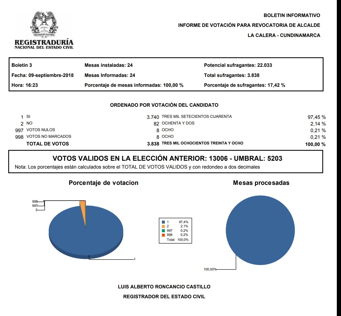 Con el 100 % de las mesas escrutadas, la Registraduría anunció que la jornada de votación que definía el futuro de la alcaldesa de La Calera, ni siquiera pasó el umbral. De entrada, la gran ganadora de los comicios fue la abstención: de los 22.033 habitantes habilitados para votar en el municipio, solo 3.838 llegaron a las urnas. Y de ese total, 3.740 votos (97,4 %) fueron por el "Sí", y 82 (2,1 %) por el "No". En la jornada también hubo ocho votos nulos y otros ocho no marcados.