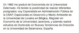 Dos (2) semestres de especialización como administrador público NO graduado (1991); dos (2) semestres de PhD en "nuevas tendencias en administración" NO graduado (1996) y dos semestres de MG (Magíster) de economía, NO graduado (sin año).