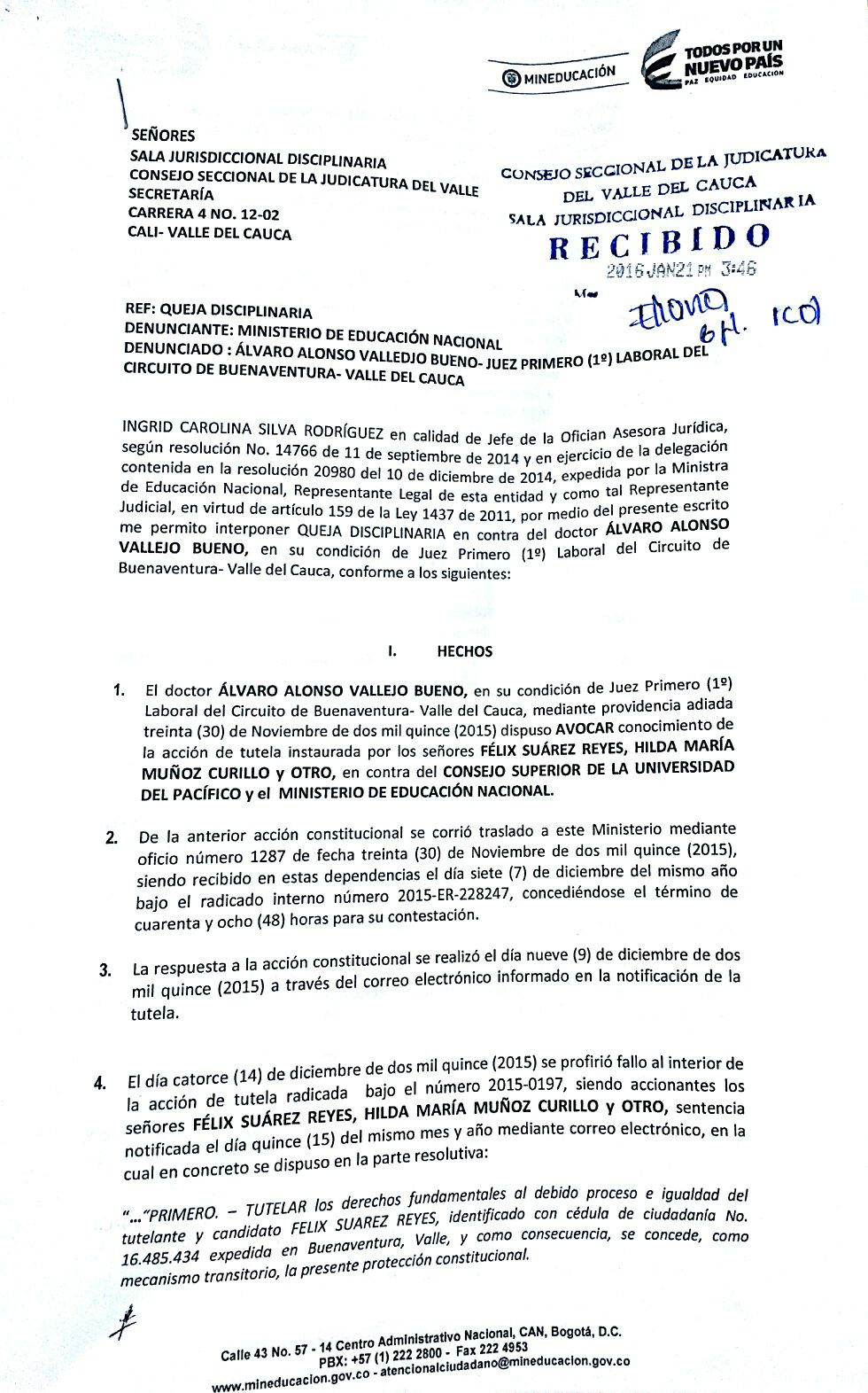 La ministra de Educación, Gina Parody, publicó a través de Twitter la solicitud que hizo a finales de enero el Gobierno ante el Consejo Seccional de la Judicatura del Valle del Cauca para que sea investigado el juez primero laboral del circuito de Buenaventura, Álvaro Alonso Vallejo.