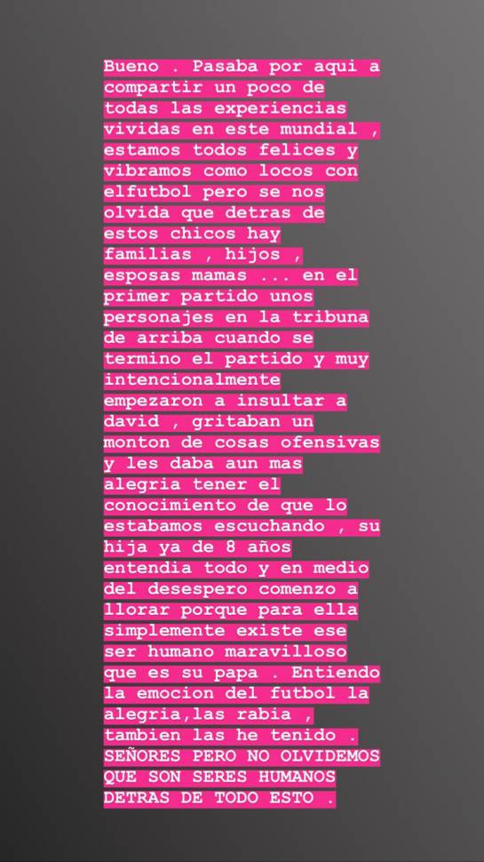La modelo y empresaria Daniela Ospina por medio de su cuenta de Instagram comentó lo qué pasó durante el partido de la selección Colombia frente a Japón: “Estamos todos felices y vibramos como locos con el fútbol. Pero se nos olvida que detrás de estos chicos hay familias, hijos, esposas, mamás… En el primer partido unos personajes en la tribuna de arriba cuando terminó el partido y muy intencionalmente empezaron a insultar a David. Gritaban un montón de cosas ofensivas y les daba aún más alegría tener conocimiento de que lo estamos escuchando”.