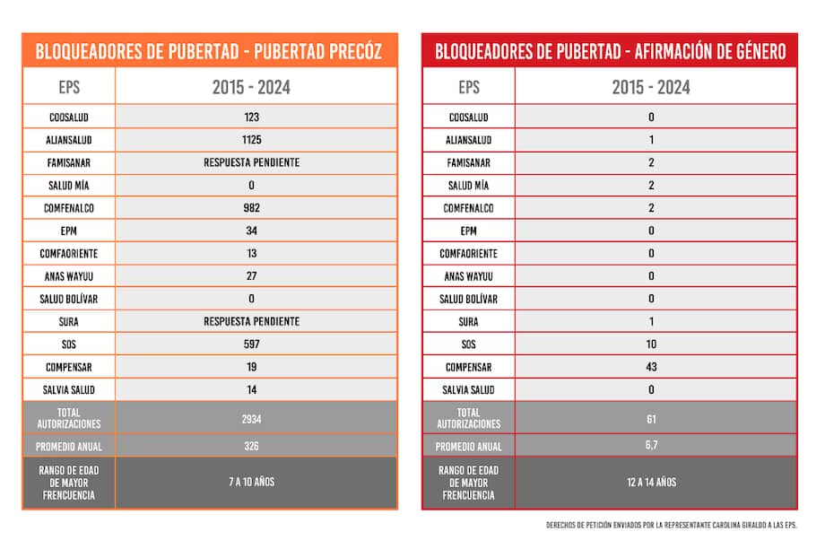 En Colombia, de acuerdo con los datos obtenidos por la congresista Giraldo a través de derechos de petición a las Entidades Promotoras de Salud (EPS), cada año alrededor de 326 menores cisgénero, entre 7 y 10 años, acceden a bloqueadores de pubertad. En contraste, solo 6,7 niños trans, mayores de 12 años, reciben estos tratamientos como parte de su afirmación de género.