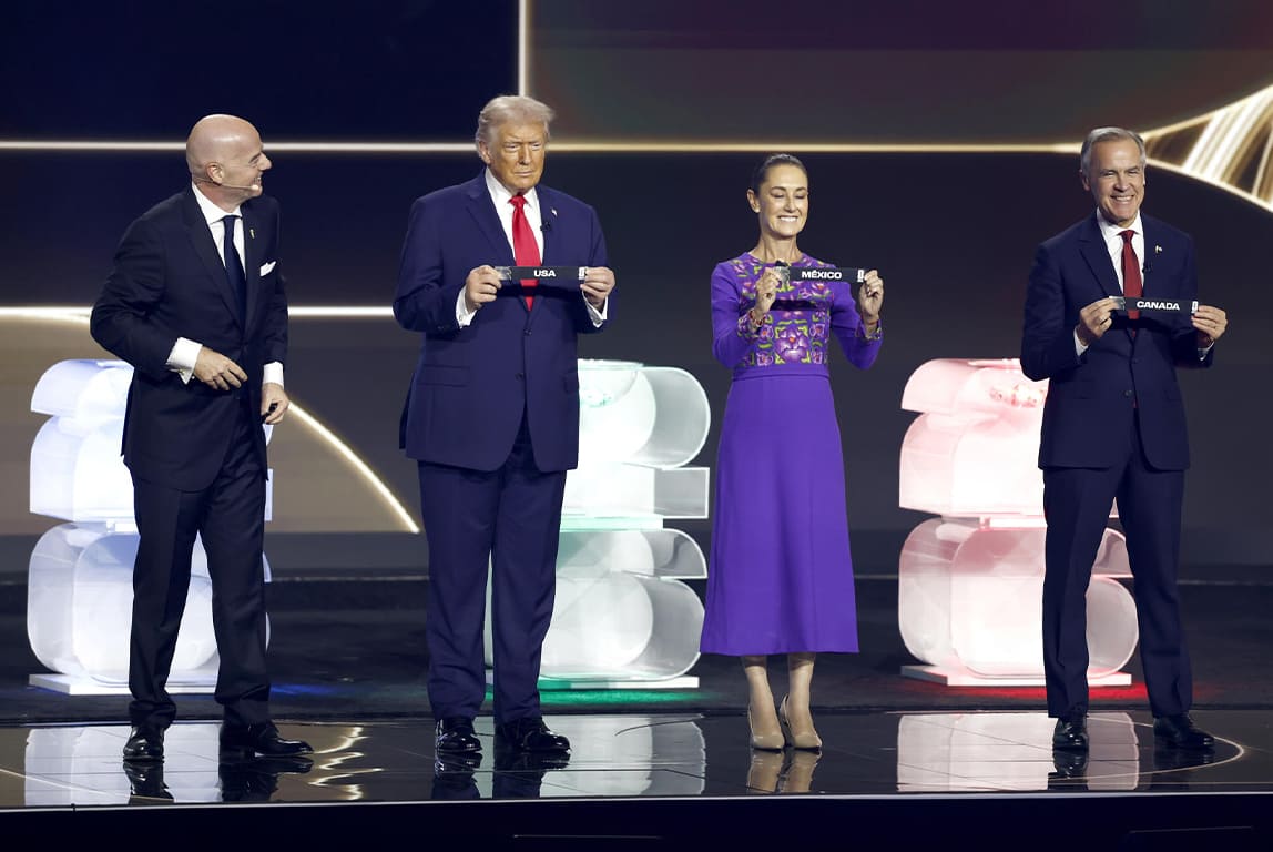 El presidente de la FIFA, Gianni Infantino (i); el presidente de Estados Unidos, Donald Trump (2-i); la presidenta de México, Claudia Sheinbaum (2-d); y el primer ministro de Canadá, Mark Carney, durante el sorteo de la Copa Mundial de la FIFA 2026 en el Kennedy Center en Washington (EE.UU.) (EFE)