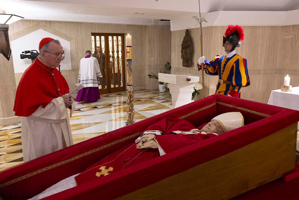 El camarlengo, cardenal Kevin Joseph Farrell, permanece ante el ataúd del papa Francisco durante el rito oficial de constatación de su muerte en la Capilla de Santa Marta, en la Ciudad del Vaticano. El fallecimiento del pontífice marcó el inicio del período de sede vacante. (EFE)