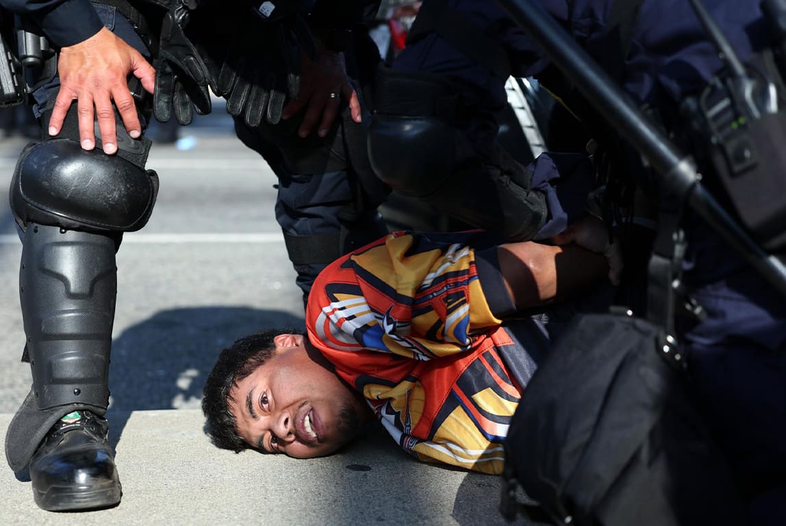 Un manifestante es detenido durante las protestas contra las redadas migratorias en Los Ángeles, California, el 10 de junio de 2025. Desde la llegada de Donald Trump a la presidencia en enero, su administración impulsó la mayor campaña de deportaciones masivas en la historia de Estados Unidos. (EFE)