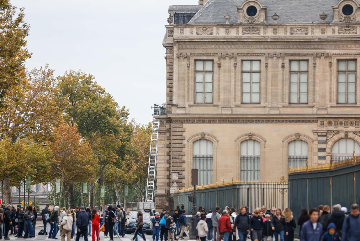 Una escalera extensible utilizada por tres ladrones para acceder a los pisos superiores del museo es observada durante la investigación tras un robo en el Museo del Louvre, en París, el 19 de octubre de 2025. El asalto reabrió el debate sobre la seguridad de los grandes museos europeos. (EFE)