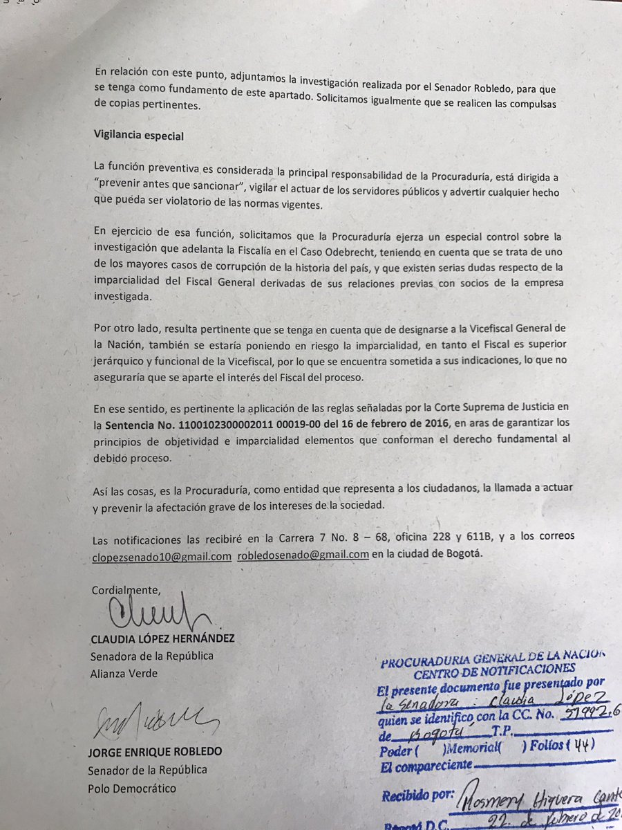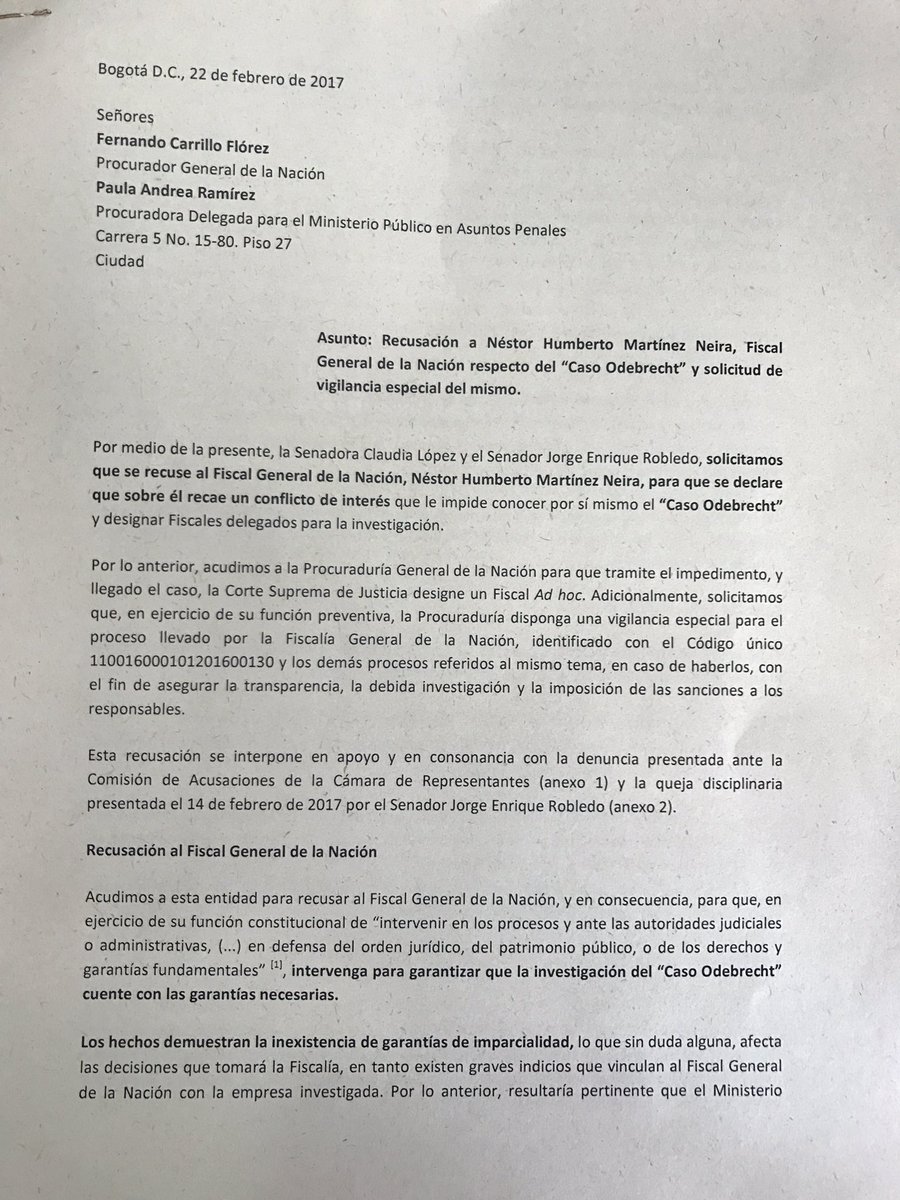 Tras esta respuesta, la senadora de la Alianza Verde, Claudia López y el senador Jorge Robledo, radicaron este miércoles ante la Procuraduría General de la Nación y la Corte Suprema de Justicia una solicitud de recusación contra el fiscal general por el “Caso Odebrecht” pidiendo además que se nombre a un fiscal ad hoc en este caso.