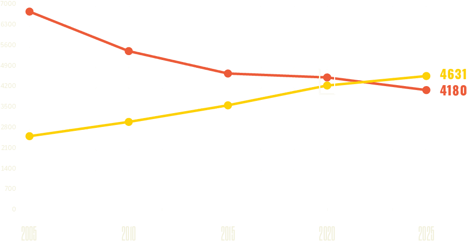 Y, de hecho, ya se presentó un cruce significativo. Por primera vez, en 2022 y según las cifras disponibles, el número de ancianos superó al de niños. Según las proyecciones disponibles hasta 2042, esa tendencia se mantendrá.