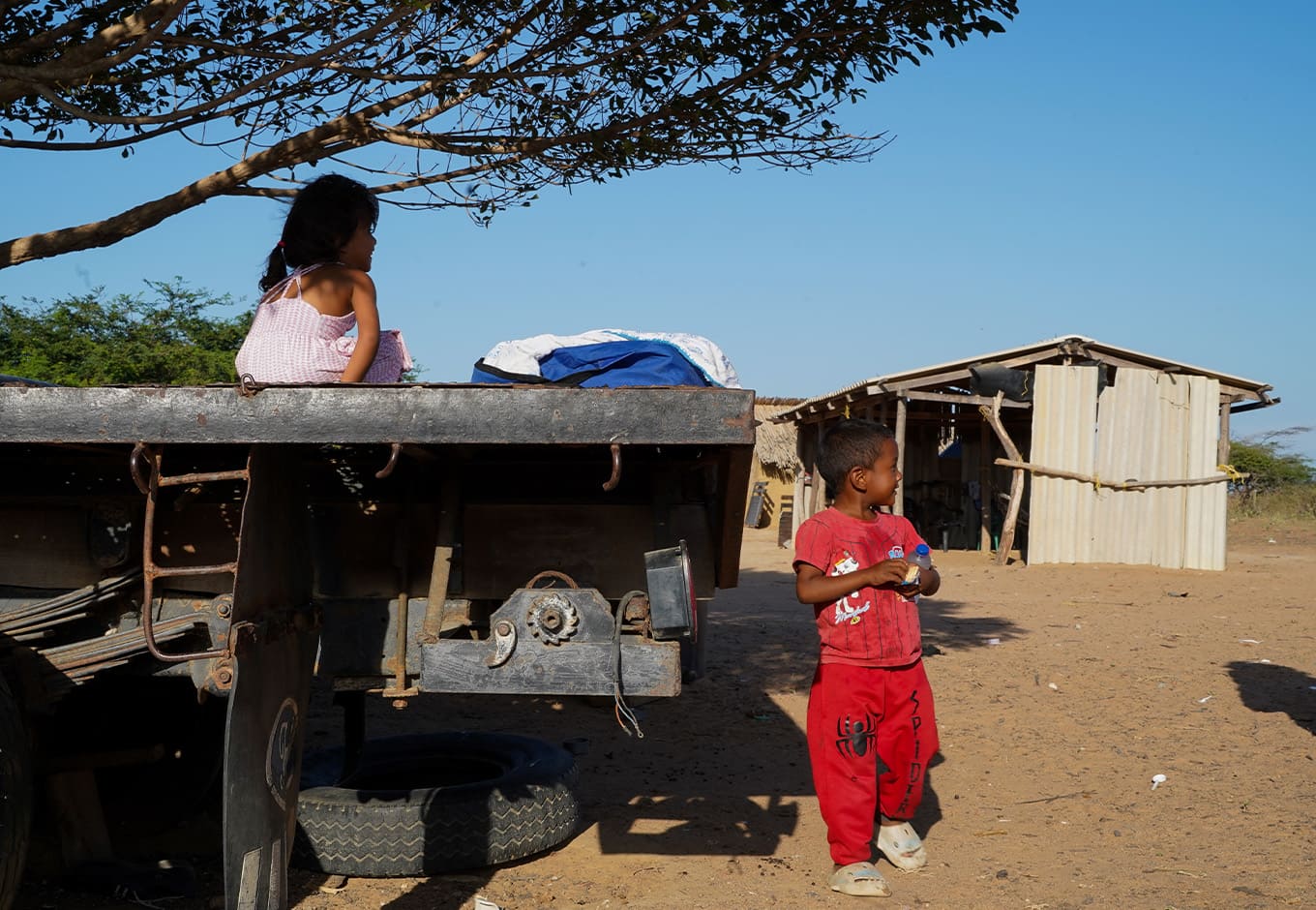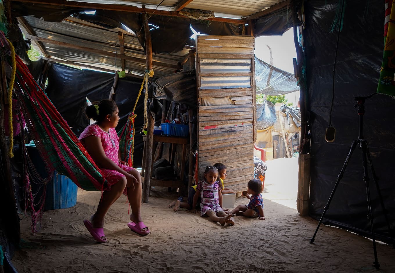 Yusmari vive con sus tres niños y su esposo en una casa que construyeron con láminas de lata y polisombra, materiales que hacen que los 35 ° de temperatura que marcan casi que diariamente se sientan más calientes. Cuando hay sed deben ir hasta la tienda del asentamiento o hasta la casa de July, la lideresa del lugar, a comprar bolsas de agua o una gaseosa. Y cuando quiere ir al baño debe caminar 300 metros para ir a la casa de su suegra, que sí tiene baño.