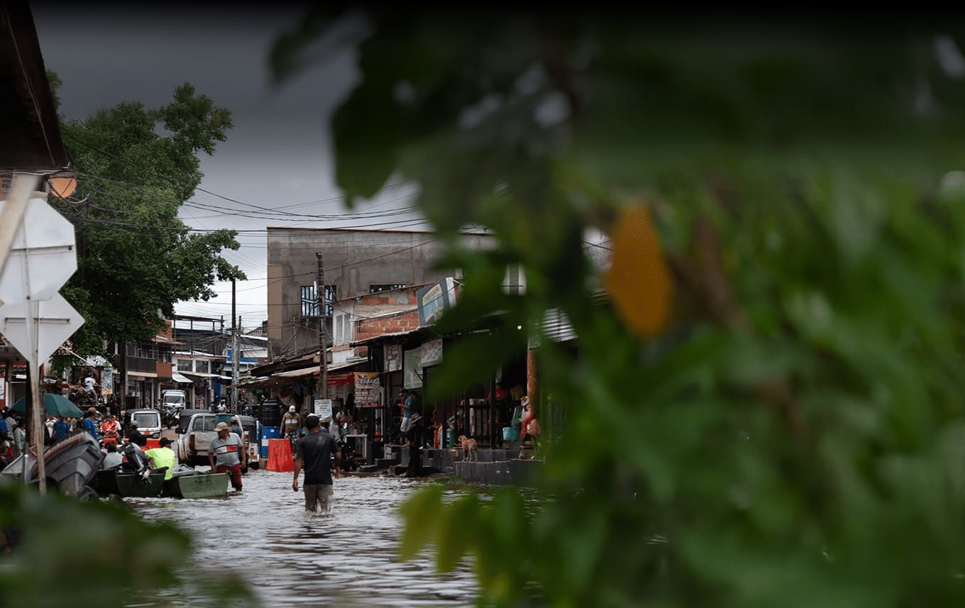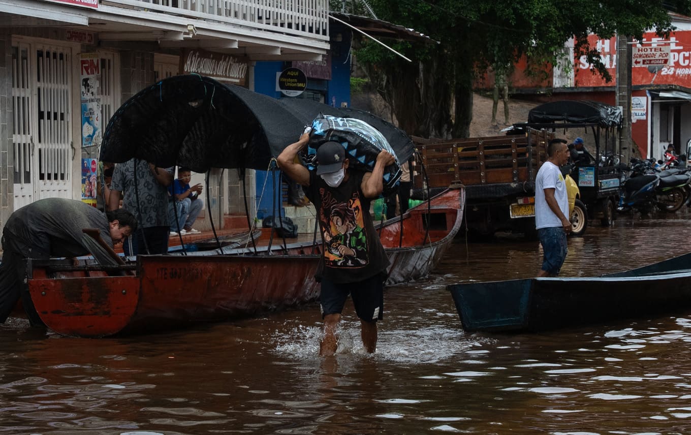 El profe de la escuela de fútbol contempla abatido cómo el río se tragó la cancha y el parque infantil en los que hace dos semanas entrenaba con sus muchachos; solo los travesaños de los arcos se asoman entre las ondas de agua marrón claro y dan fe de su recuerdo. Los comerciantes del pueblo, en medio de algunos chistes y risas, pero con el afán propio de la angustia, corren cargando de un lado a otro cajas, arrobas de arroz y todos sus productos para salvarlos de la inundación. Bajo la humedad pesada de mitad de año, la gente corre con sus trasteos y mascotas a buscar arriendo o posada en las zonas altas. El alcalde, notablemente estresado, no sabe si contestar más llamadas en las que le piden ayuda o seguir haciendo las suyas a Bogotá e intentar que algún funcionario envíe mercados, maquinaria amarilla, plata.