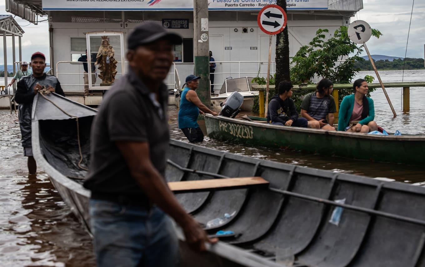Las nubes no paran de descargar; por la noche aguacero, por la mañana llovizna insomne. El Orinoco avanza indomable y, alimentado por sus vecinos Meta y Bita, tapa primero al muelle, luego a las calles, los andenes, las bancas y, finalmente, a las casas de quienes están más a la orilla. La creciente también amenaza a la Virgen del Carmen que custodia al puerto. Temerosos de verla como en las inundaciones de 2018, cuando parecía caminar sobre el agua o incluso estar a punto de ahogarse, los vecinos la sacan de su urna para resguardarla.