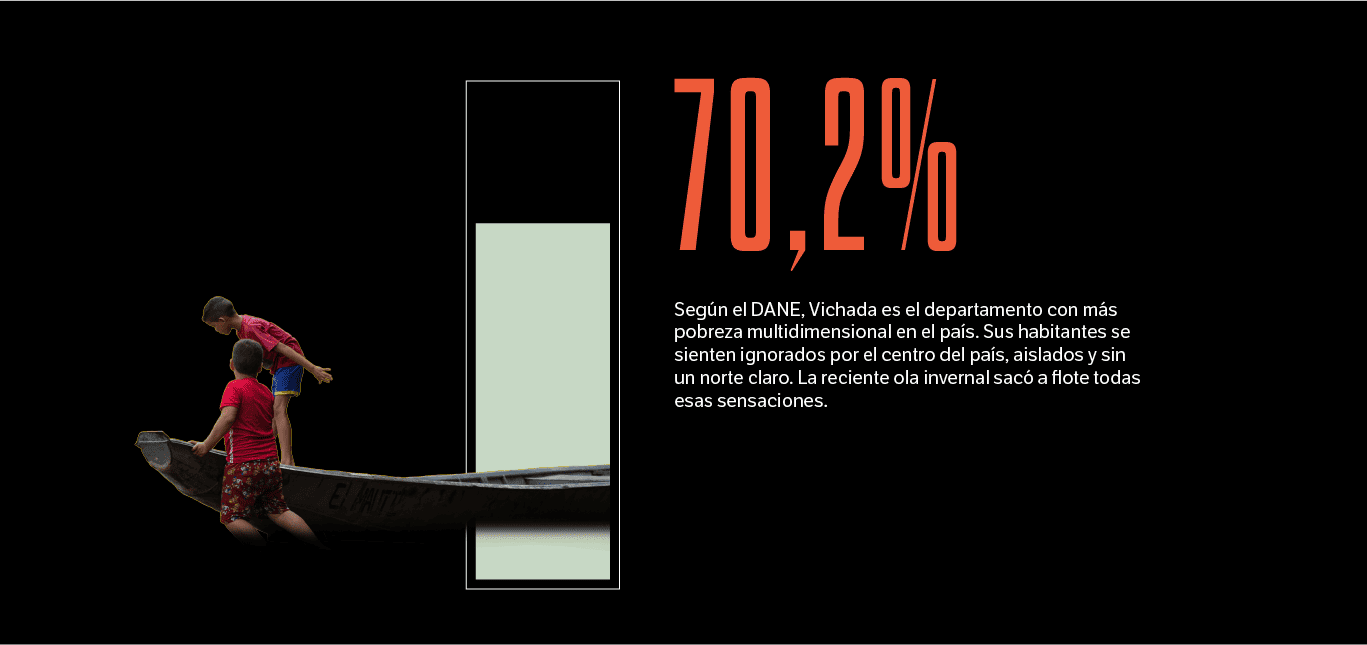 El miedo, la tristeza, la rabia, la resignación, la impotencia y otra maraña de emociones y sentimientos se desbordan en la gente casi tan rápido como lo hace el río. En Vichada, muchos sienten que la crisis desatada por la reciente ola invernal es un recordatorio de lo apartados que están del resto del país, de la ignorancia del centro sobre sus problemas y virtudes, de que es muy probable que el DANE tenga razón al decir en una de sus encuestas más recientes que este es el departamento con más pobres multidimensionales del país, pues a siete de cada diez vichadenses no les alcanza para suplir las necesidades que se requieren para afirmar que hay calidad de vida en sus hogares.